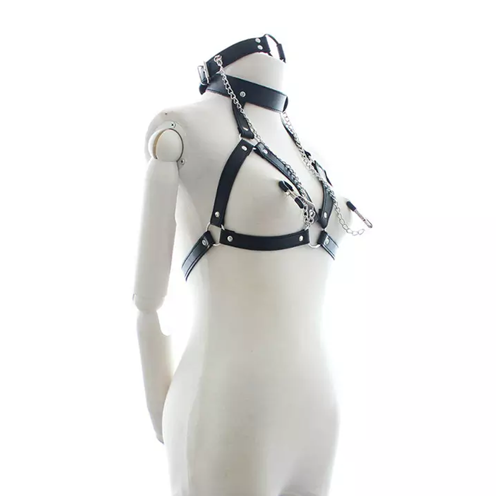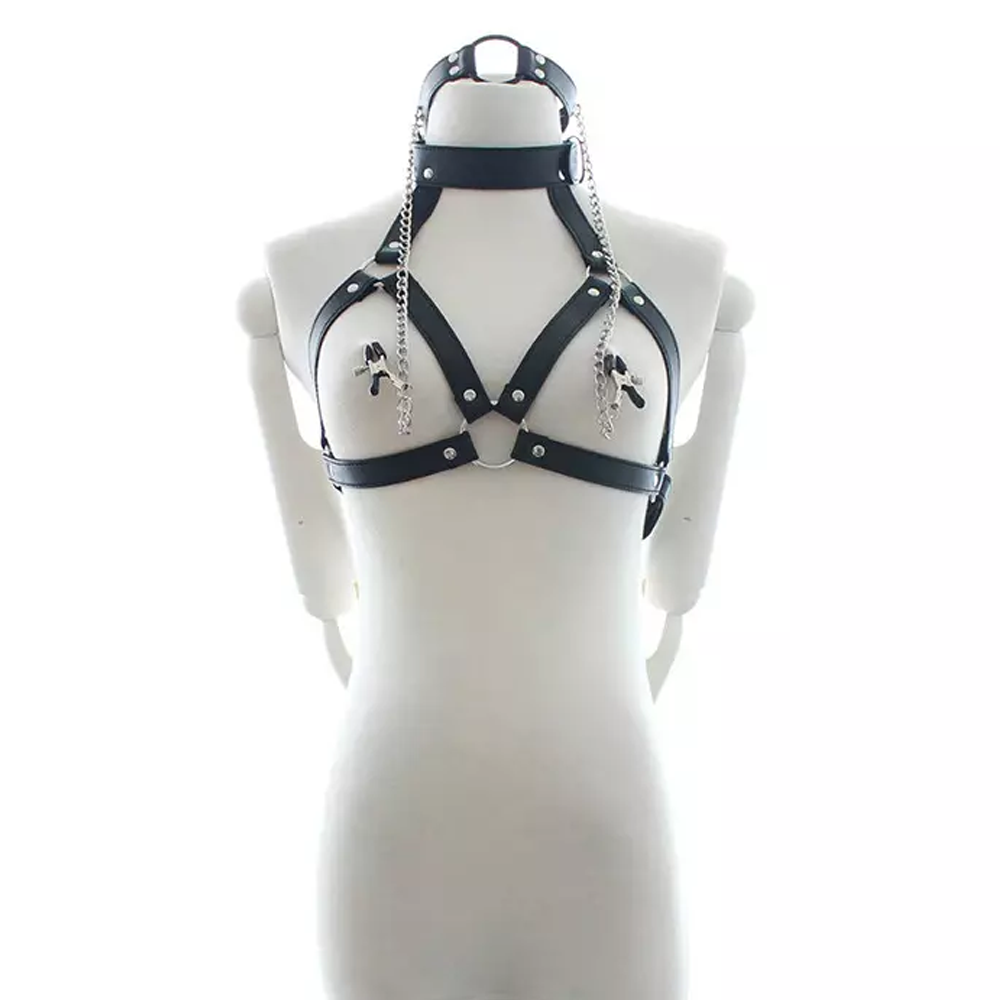 Get dressed for the occasion with this adjustable vegan leather harness, which comes with an attached ring gag. The harness fits around the breasts and is connected to a choker, which is what the ring gag attaches to. Nipple clamps are attached to the choker for extra pleasure or punishment.