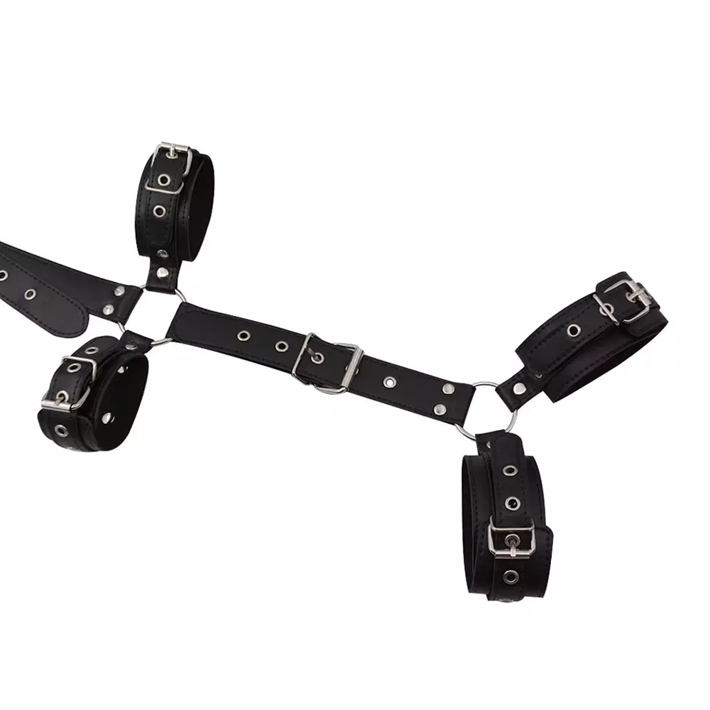 With this full body cuff set you can ensure your sub won’t be going anywhere. Enjoy the full control of your partner with adjustable neck, wrist and ankle straps connected to a full length cruelty-free leather strap running along their back. A perfect item for serious bondage and restraint.