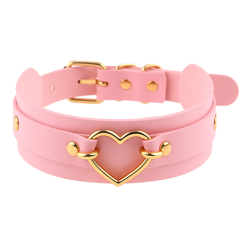 Show the world how proud you are of your submissive role with our Heart of Gold Choker. This cute collar is made from 100% vegan leather with a golden heart on the front and golden studs all the way around. It is fully adjustable so you can wear it in comfort while the heart enables your master or mistress to attach a lead to your choker.