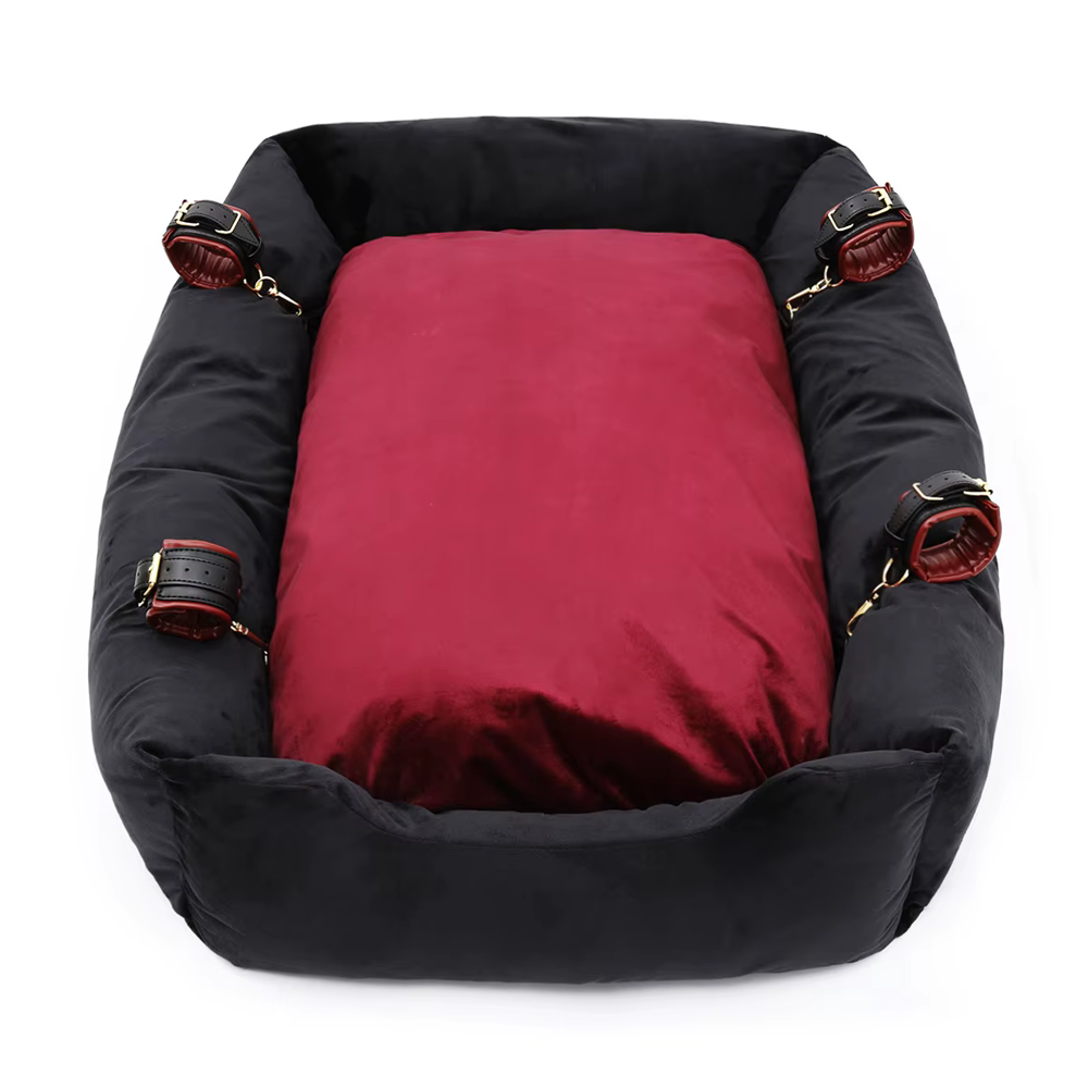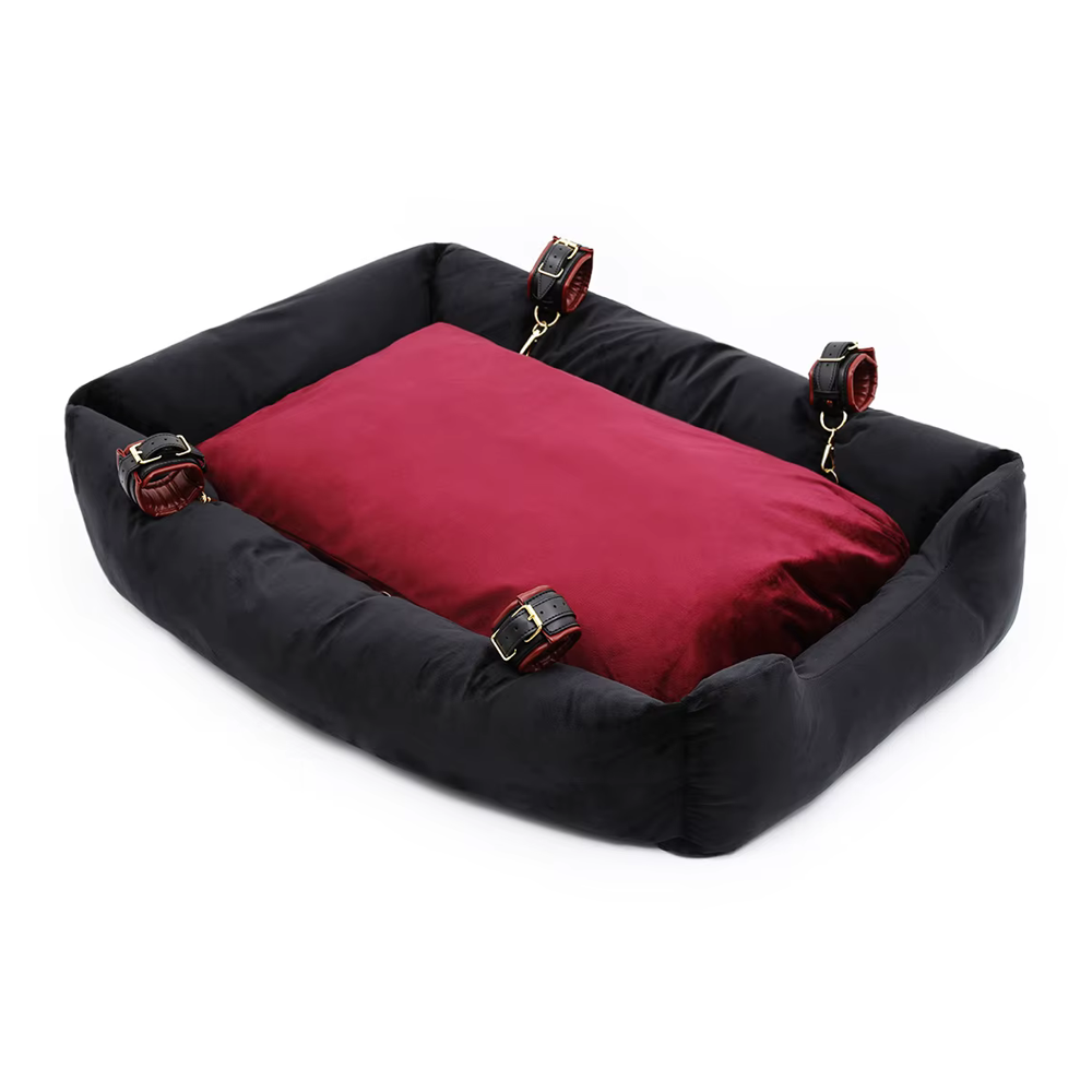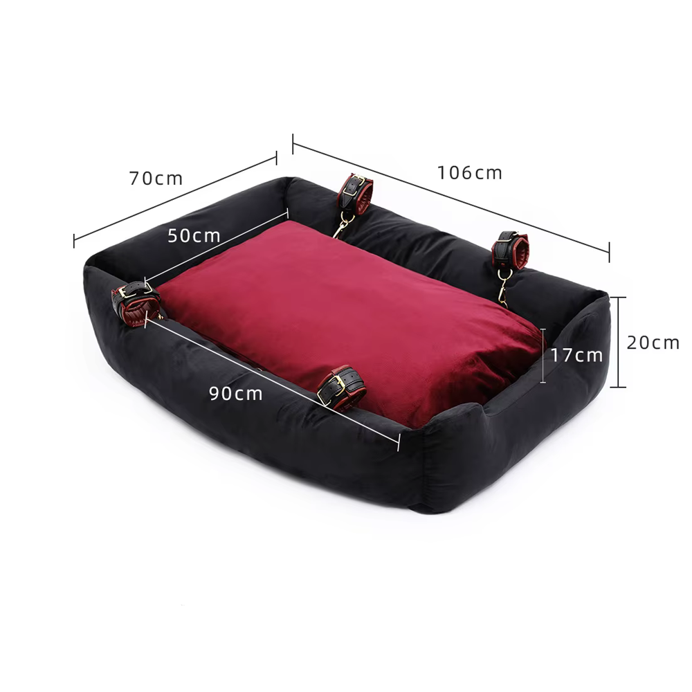 Sink into submission with the Pup Play Bed, built for comfort, control, and obedience. Crafted in sleek black with a bold red detachable pillow, this bed sets the scene for roleplay, restraint, and rest. Four sturdy cuffs are attached at each corner, ready to keep your pup exactly where they belong. Whether used for playful lounging or a timeout for a naughty pup, this bed combines comfort with control and is a must-have for any dedicated handler and their pup.