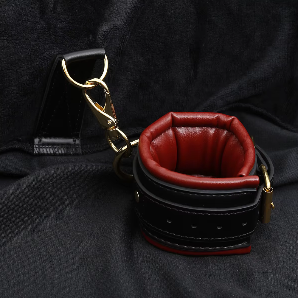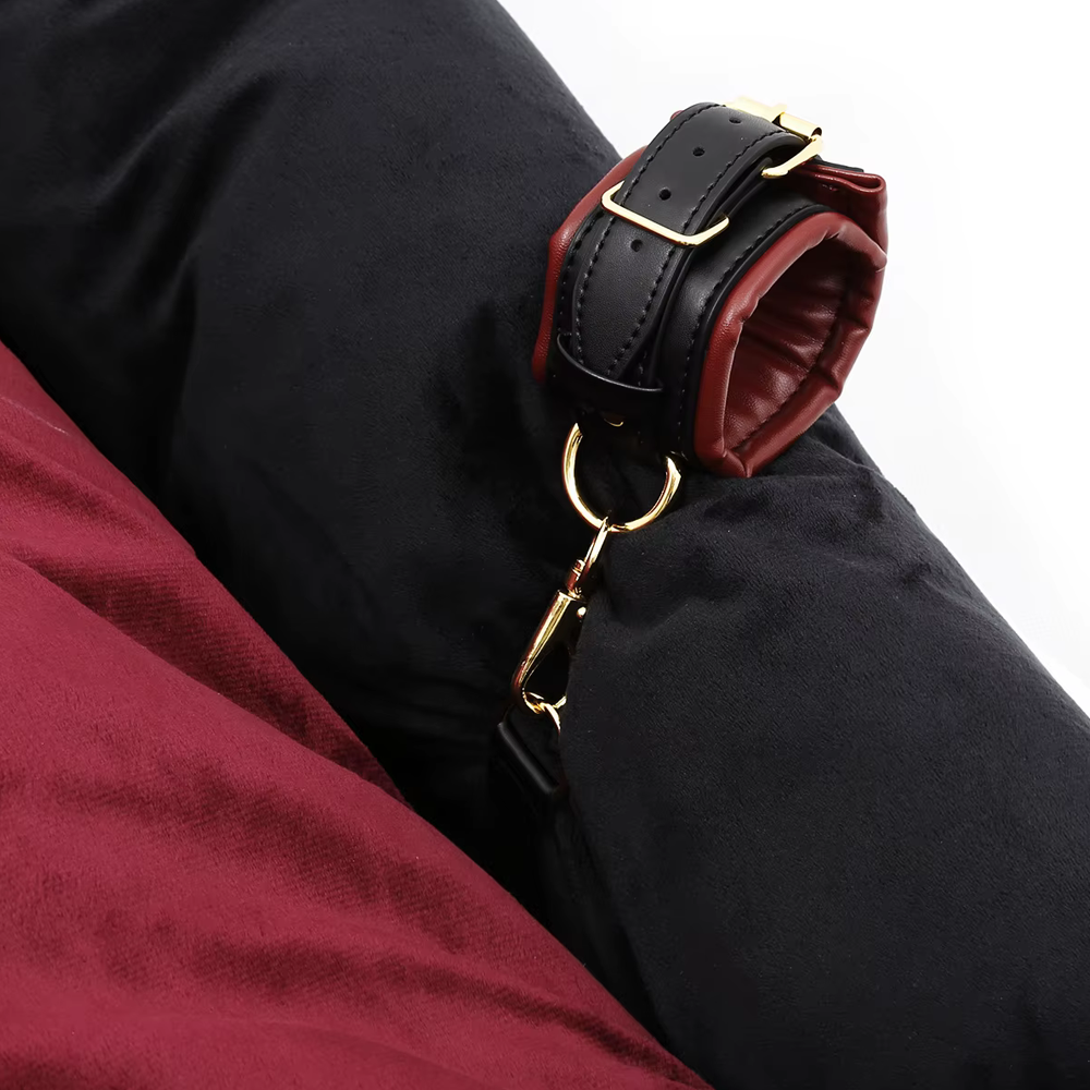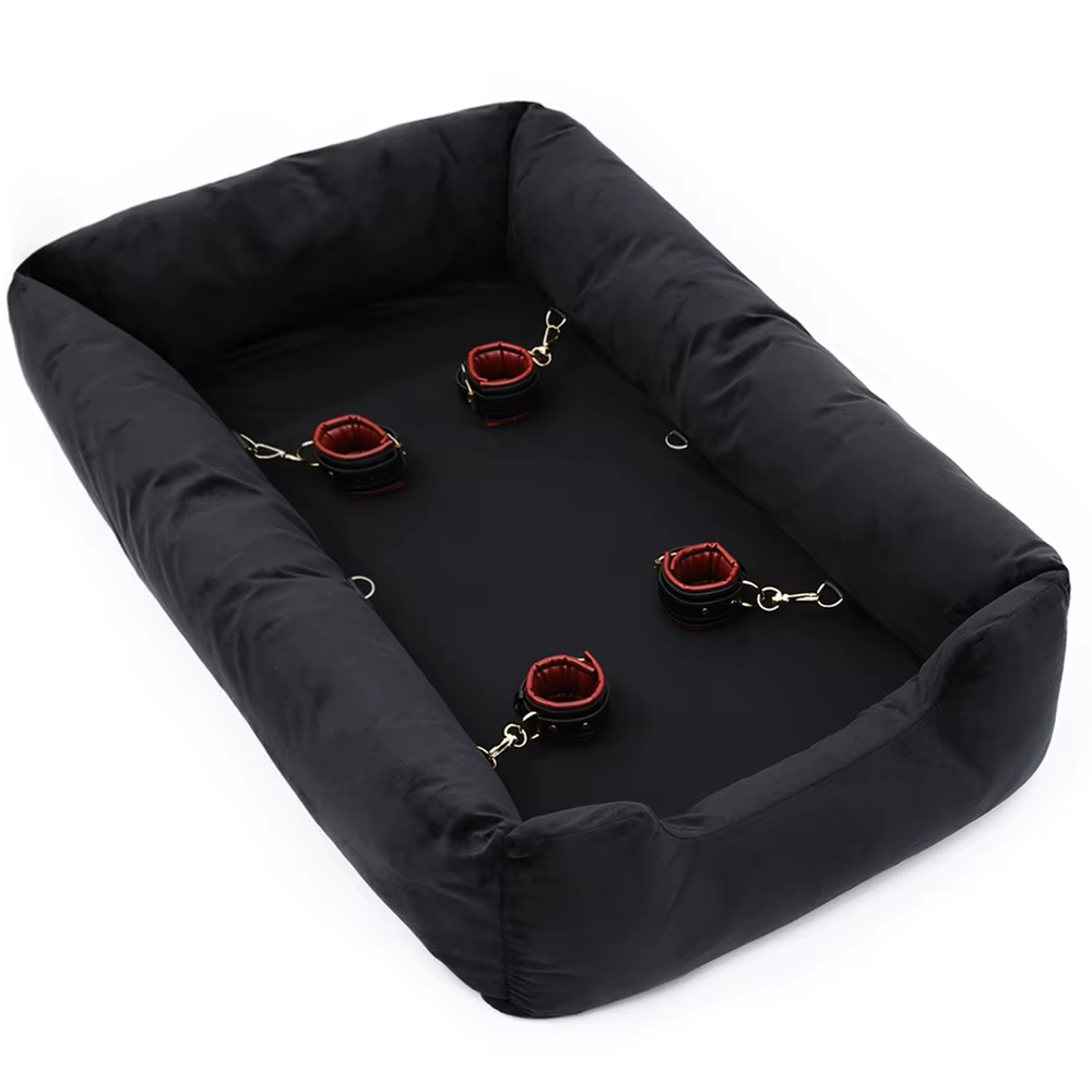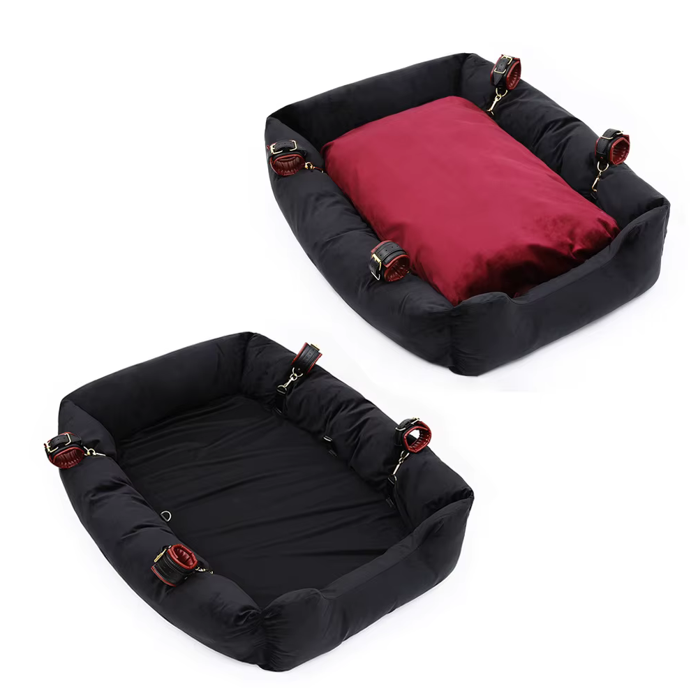Sink into submission with the Pup Play Bed, built for comfort, control, and obedience. Crafted in sleek black with a bold red detachable pillow, this bed sets the scene for roleplay, restraint, and rest. Four sturdy cuffs are attached at each corner, ready to keep your pup exactly where they belong. Whether used for playful lounging or a timeout for a naughty pup, this bed combines comfort with control and is a must-have for any dedicated handler and their pup.