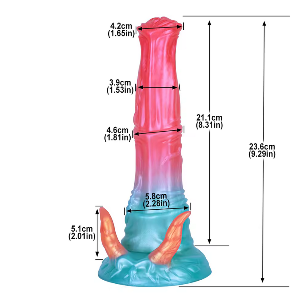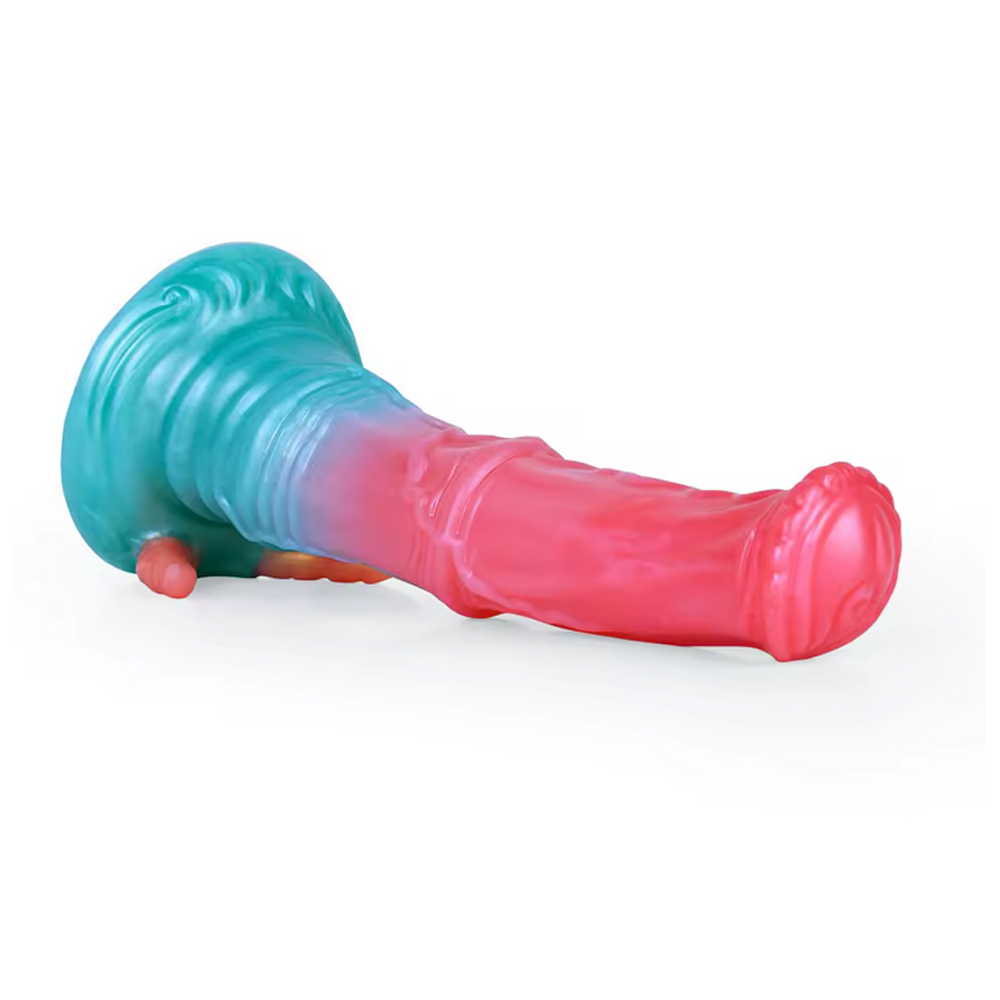 The Frosthorn Dildo, cast in an icy blue-to-pink gradient, draws inspiration from equine anatomy with a flat head, a long, ribbed shaft, and a pair of horns emerging from the base. Designed for bold and adventurous play, this toy is perfect for those seeking intense, uniquely textured pleasure.