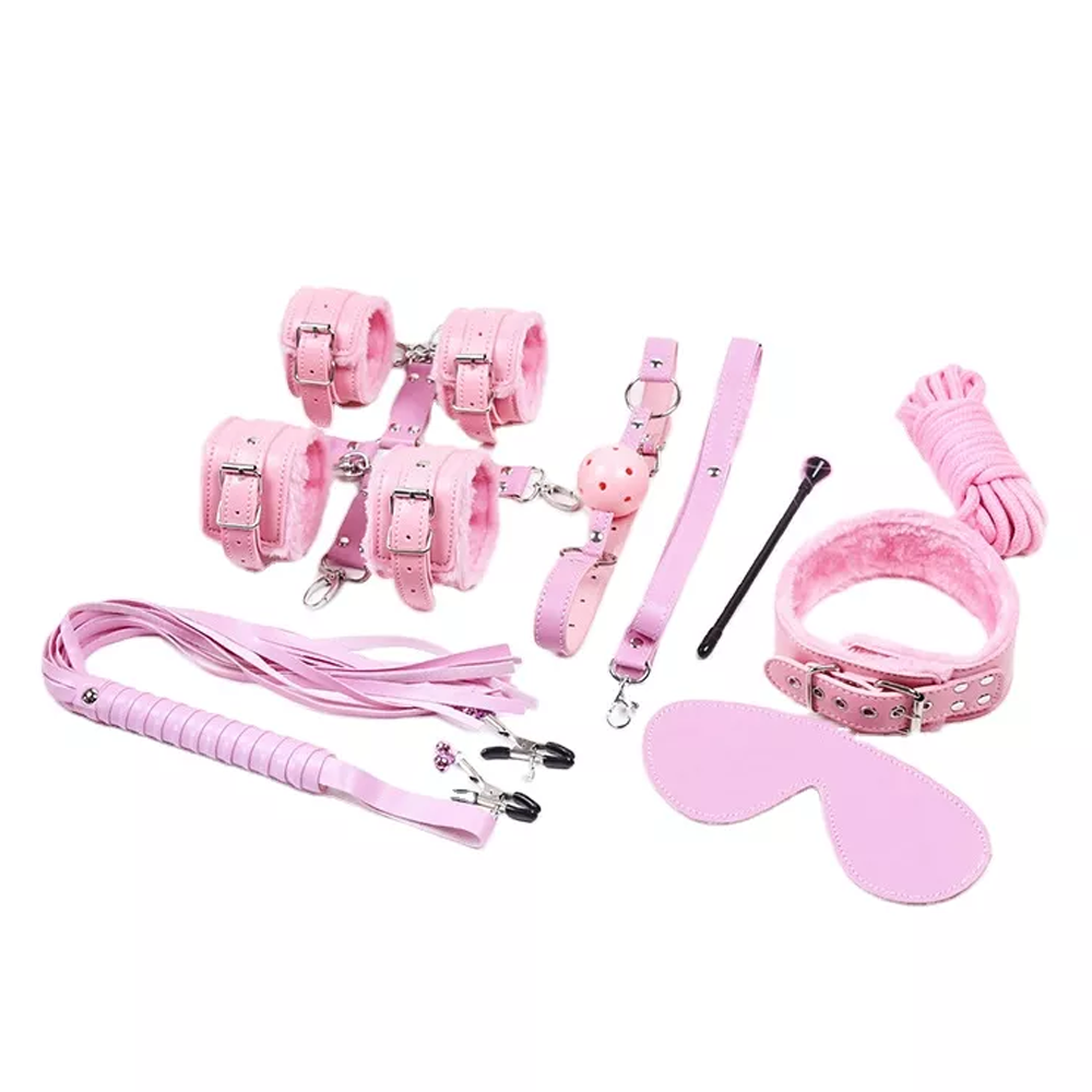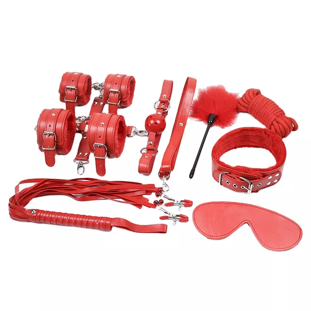 Take total control just the way you like it with this 9 piece bondage kit, made with cruelty free vegan leather. This set of BDSM toys comes in black, red or pink and contains: